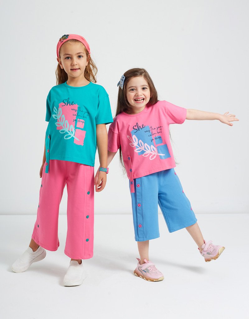Pure cotton two-piece set Girls are from 8-12 years old children A high-quality cotton T-shirt made from the finest Egyptian international cotton, and cotton pants with an export classification Khaleeji Tex is the pride of the Egyptian industry for manufacturing ready-made garments