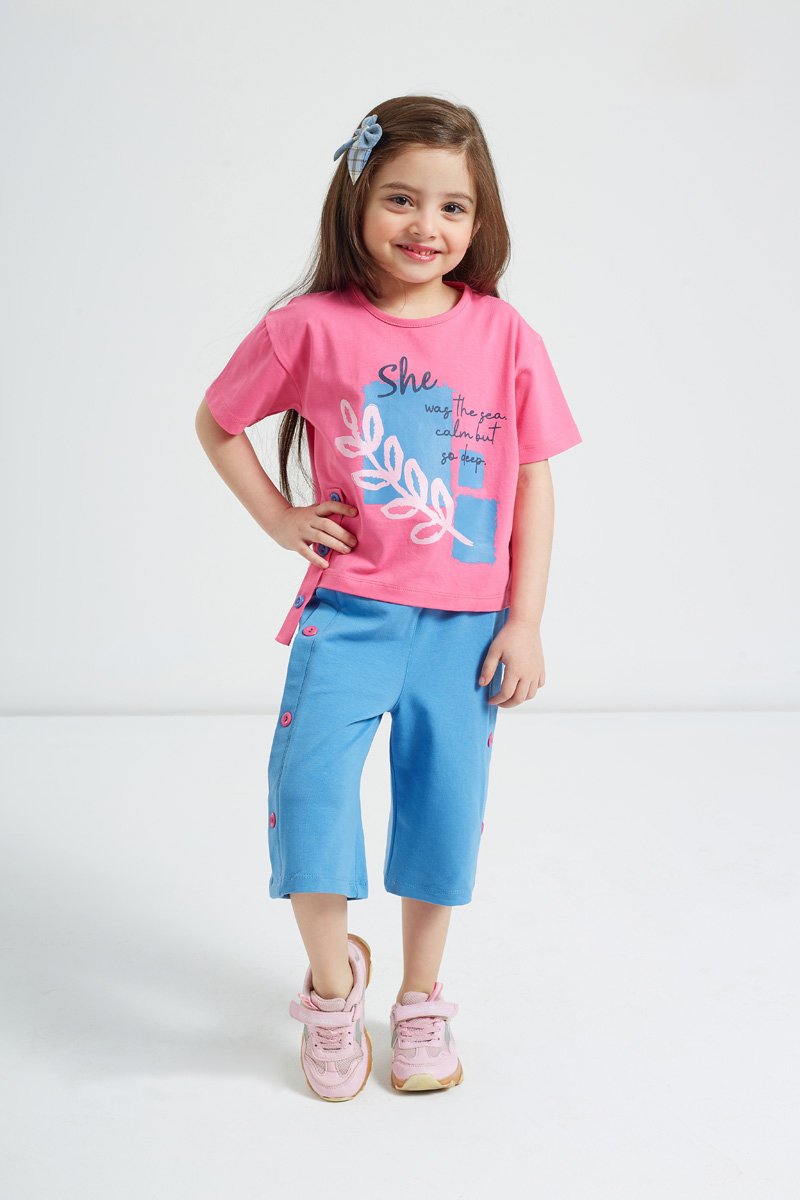 Pure cotton two-piece set Girls are from 3-7 years old children A high-quality cotton T-shirt made from the finest Egyptian international cotton, and cotton pants with an export classification Khaleeji Tex is the pride of the Egyptian industry for manufacturing ready-made garments